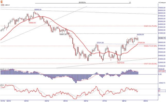 "Sem vi\351s definido, o \355ndice segue nesse zigue-zague entre os 59.500 pontos e 58.500 pontos. Apenas a confirma\347\343o do rompimento desse suporte vai abrir espa\347o para perdas mais amplas at\351 os 57.500 pontos", acrescenta o analista.